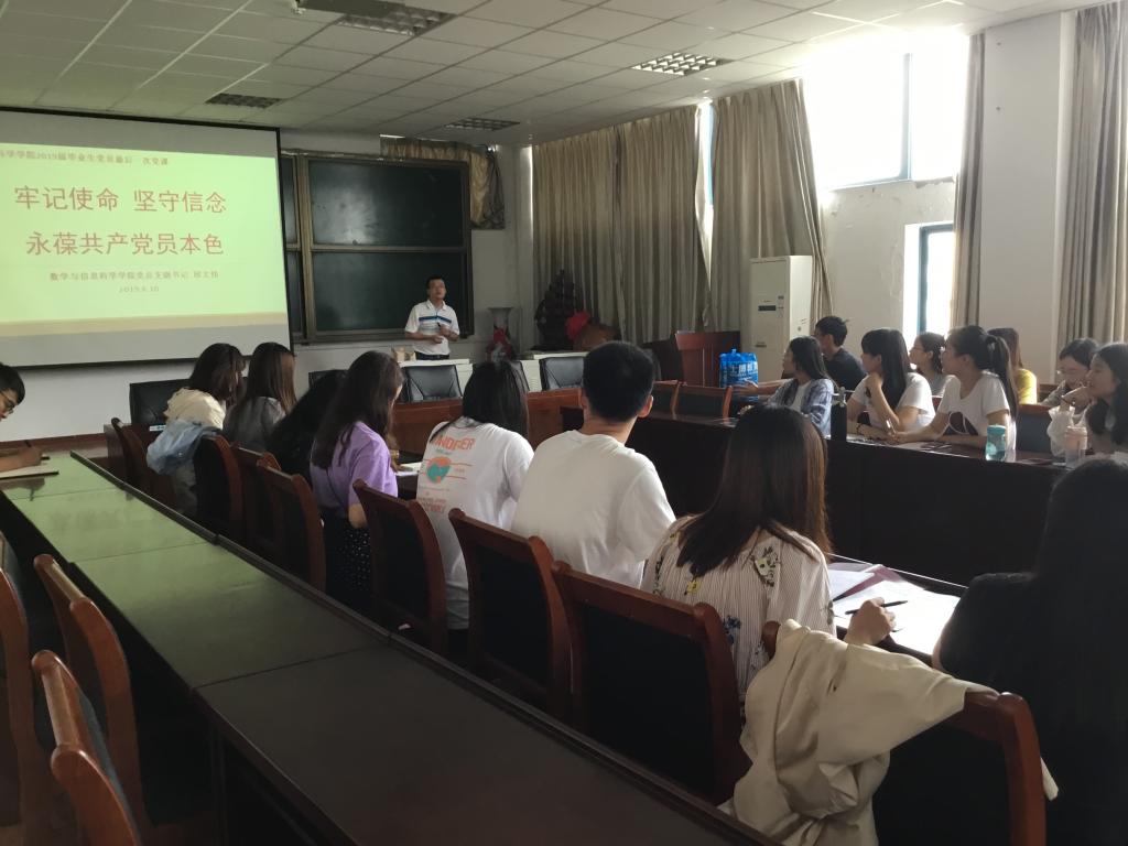党总支副书记邱文伟以“牢记使命,坚守信念,永葆共产党员本色”为主题,给2019届26名毕业生党员上了最后一次党课。课上,邱文伟带领毕业生党员们一起学习了习近平总书记在纪念五四运动100周年大会上的讲话,并向毕业生党员们提出了五点希望和要求:一是不忘初心、二是坚持理想、三是不断学习,四是勇创佳绩、五是守牢底线。他告诫毕业生党员们要严守党的政治纪律和政治规矩,切实用党纪党规规范自己的言行,切实维护好党的形象,无论以后身处什么位置,都要永葆共产党员清正廉洁本色。