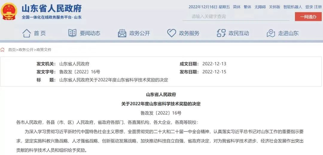 12月15日,山东省人民政府发布了《关于2022年度山东省科学技术奖励的决定》,香蕉视频