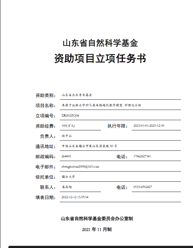 信息与统计教工党支部党员郑甲山同志主持申报的项目“来源于流体力学的几类生物趋化数学模型的理论分析”获山东省杰出青年基金项目资助,实现了学院在该项目上的突破。
