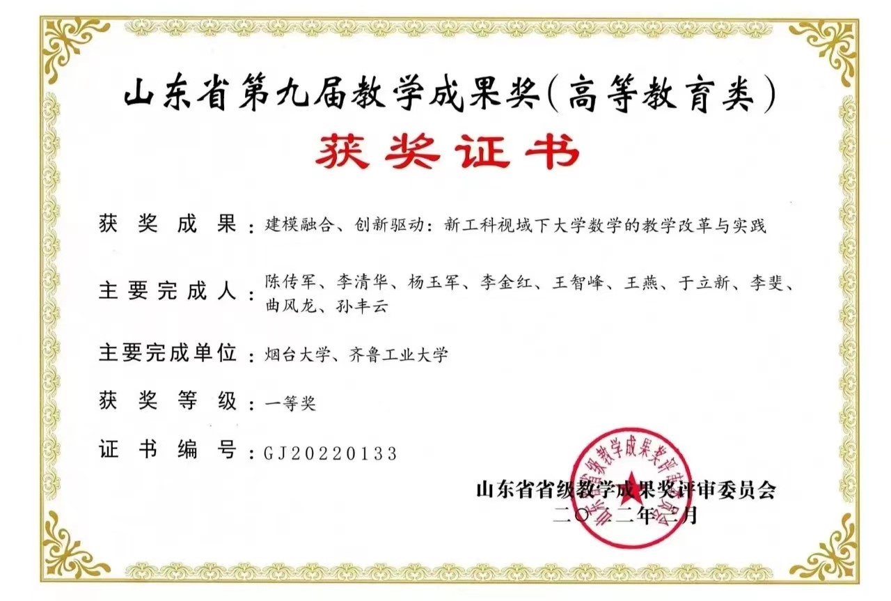 信息与统计教工党支部党员陈传军教授团队申报的《建模融合、创新驱动:新工科视域下大学数学的教学改革与实践》荣获一等奖,实现了数学院省级教学成果奖一等奖的突破。