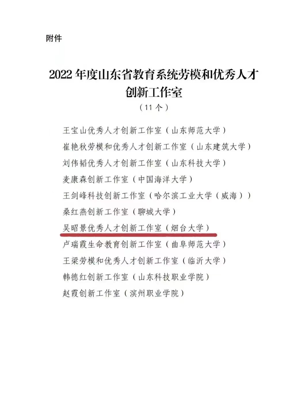 吴昭景优秀人才创新工作室等11个工作室为2022年度山东省教育系统劳模和优秀人才创新工作室。